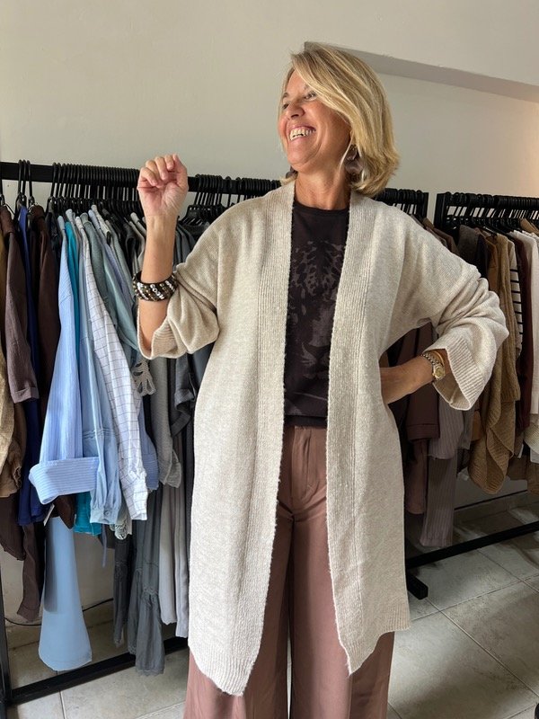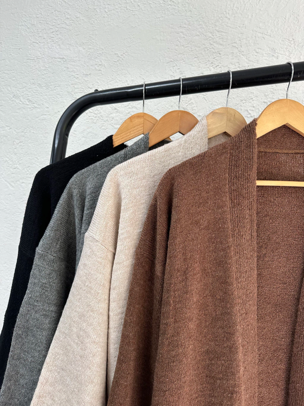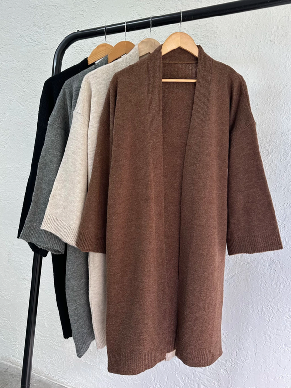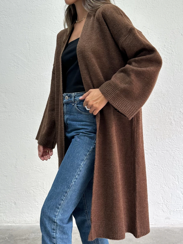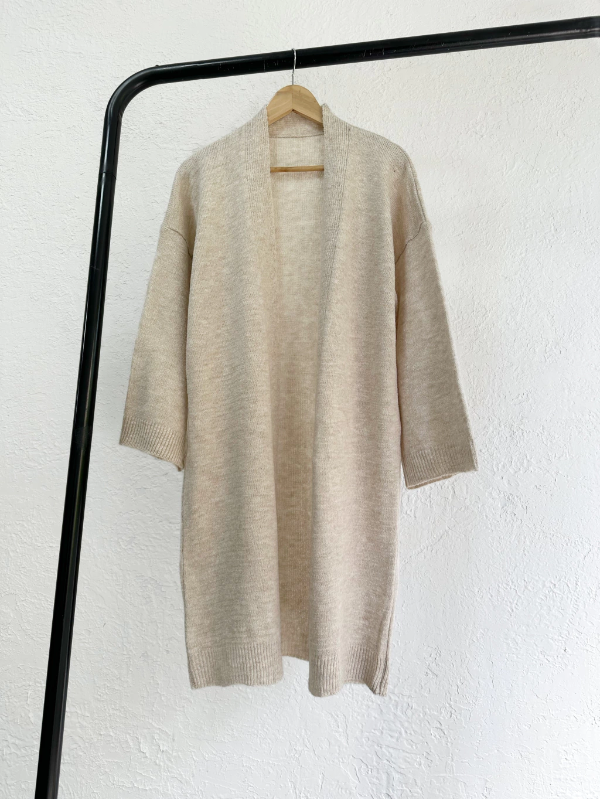 Cardigan oversize y largo. Tejido suave con detalles de manga recta.